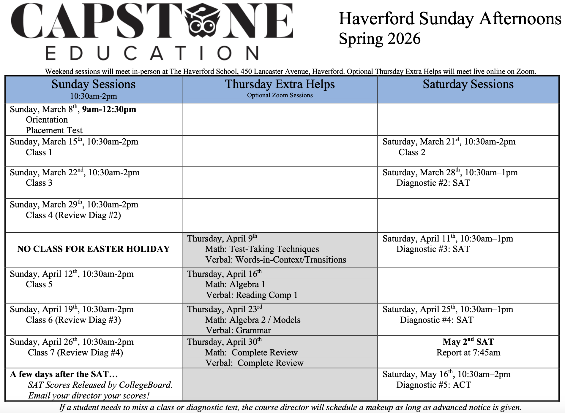 In the spring of 2026, we’re running courses all throughout the Philadelphia metropolitan area. Check out the calendars for our courses in Haverford and Newtown below! Our winter courses prepare for the May 2026 SAT. Reserve a place by filling out our online form or calling us at 484-240-9236.