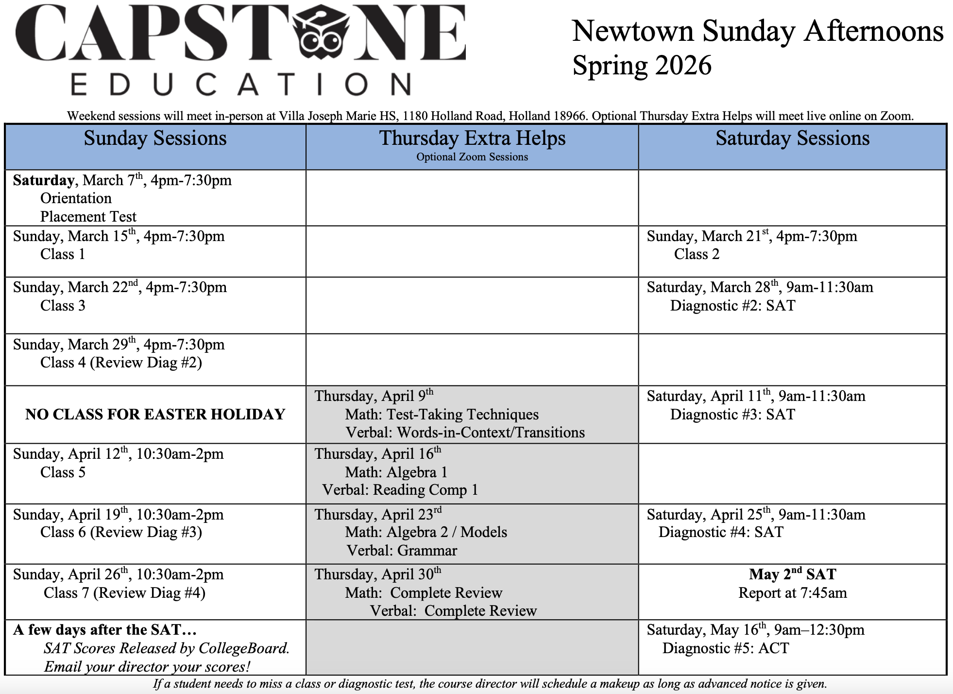 In the spring of 2026, we’re running courses all throughout the Philadelphia metropolitan area. Check out the calendars for our courses in Haverford and Newtown below! Our winter courses prepare for the May 2026 SAT. Reserve a place by filling out our online form or calling us at 484-240-9236.