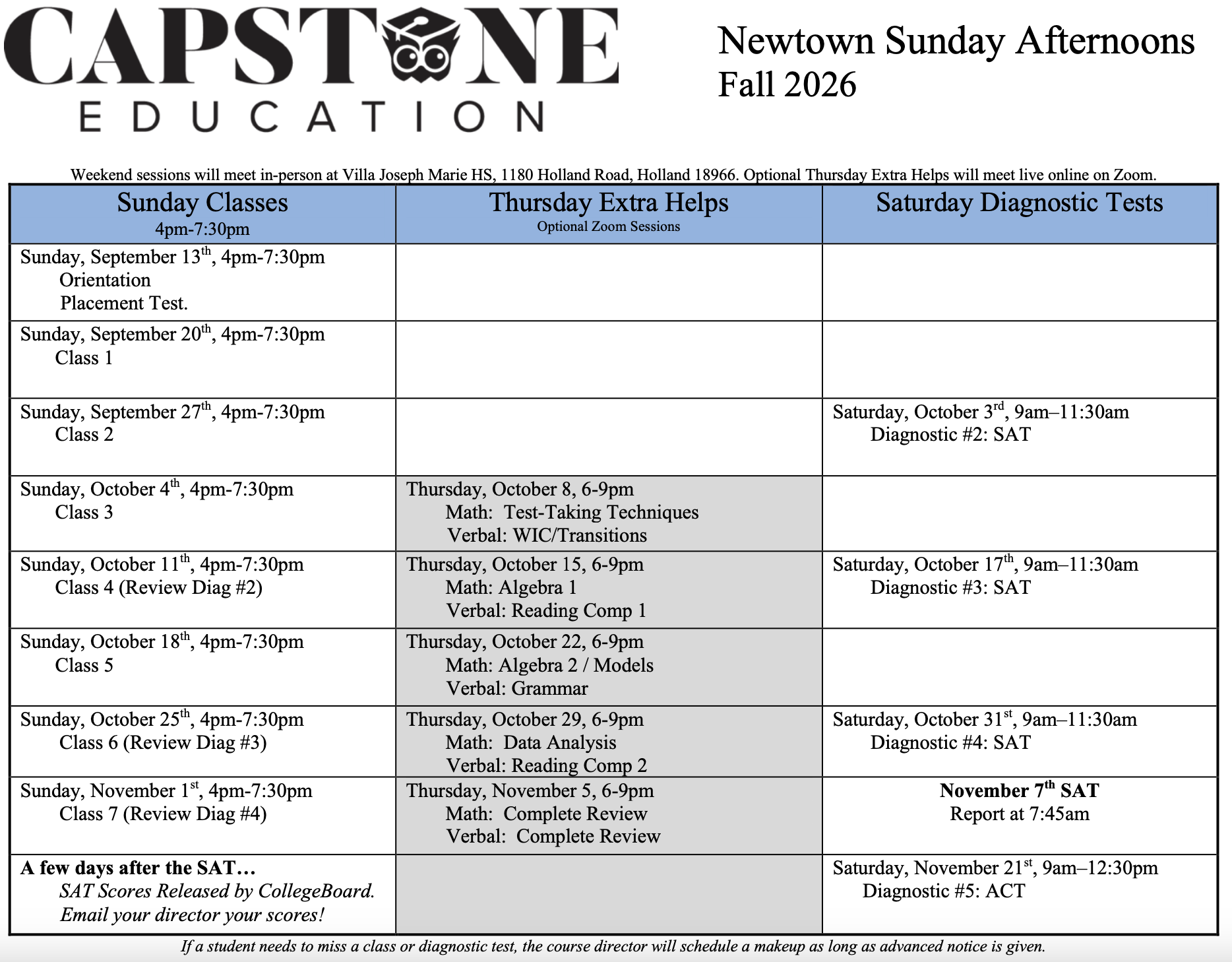 In the summer of 2026, courses meet on weekday evenings; in the fall of 2026, courses meet on weekends. Check out the calendars for our courses in Haverford, Malvern, and Newtown below! Our summer courses prepare for the August 2026 SAT, and our fall courses prepare for the November 2026 SAT. Reserve a place by filling out our online form or calling us at 484-240-9236.